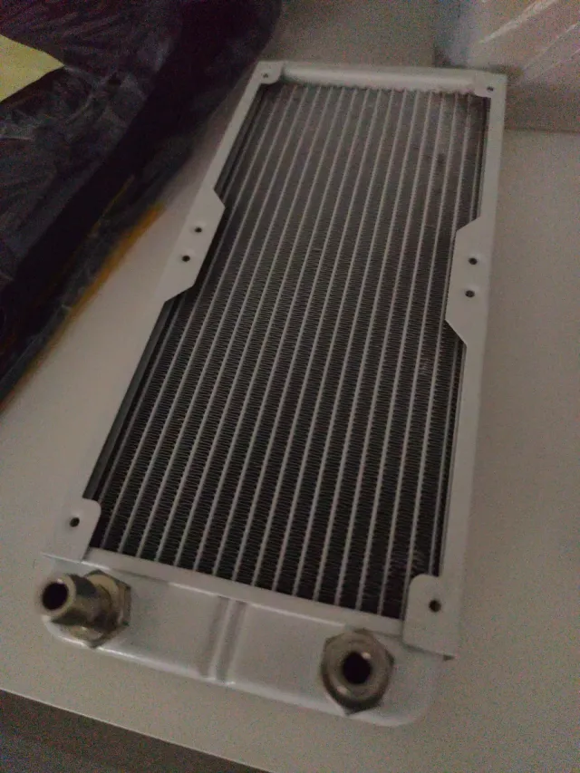 Radiador blanco para refrigeración de PC. Diseñado para sistemas de enfriamiento líquido. - Marco de metal blanco. - Conexiones para tubos. - Aletas de disipación.