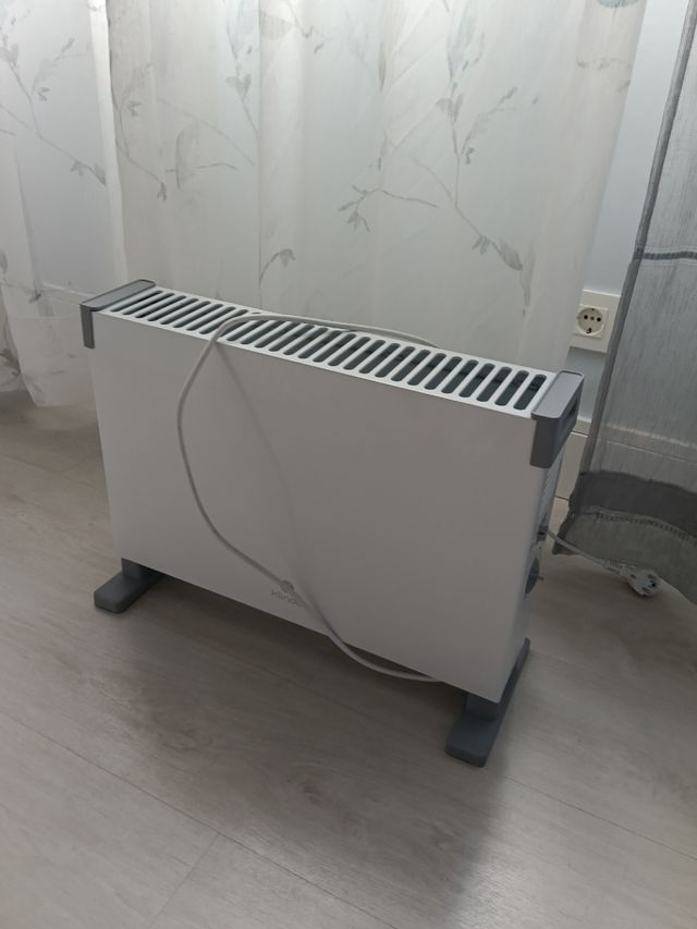 Detalles del productoRadiador eléctrico portátil de color blanco. Ideal para calentar espacios pequeños.