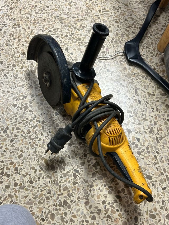 Radial Dewalt en color amarillo y negro. - Mango auxiliar. - Disco de corte. - Cable de alimentación.
