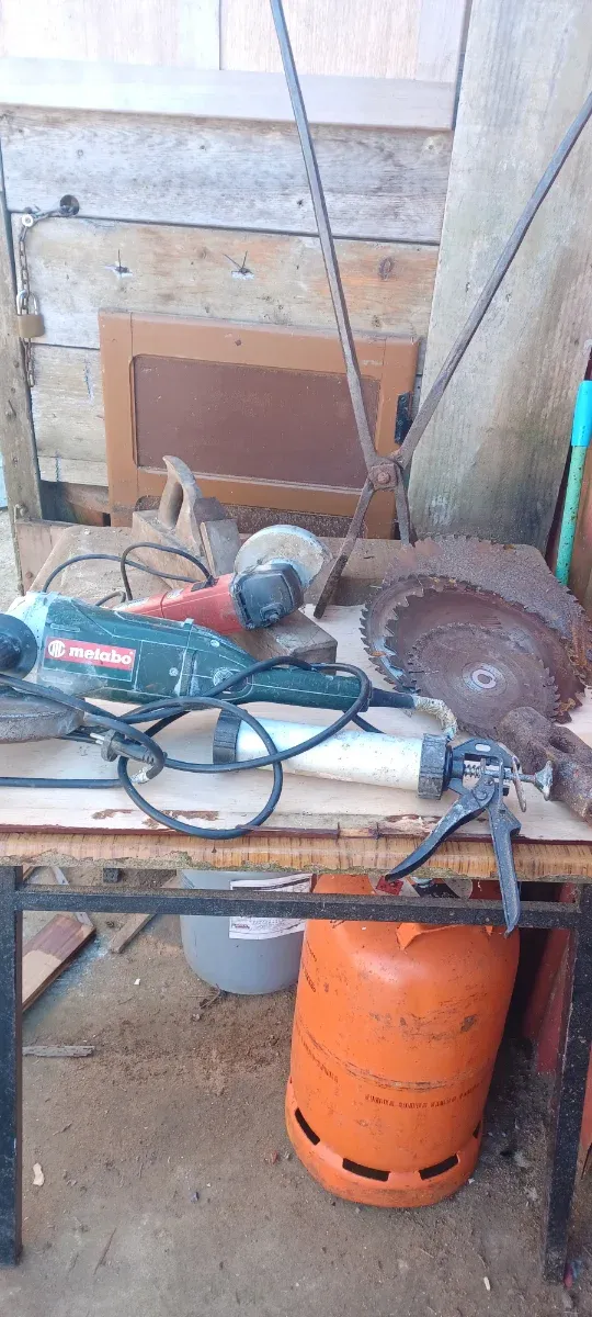 Lote de herramientas variadas, incluyendo una radial Metabo. - Radial Metabo - Sierra circular - Pistola de silicona - Tenazas - Cepillo de carpintero