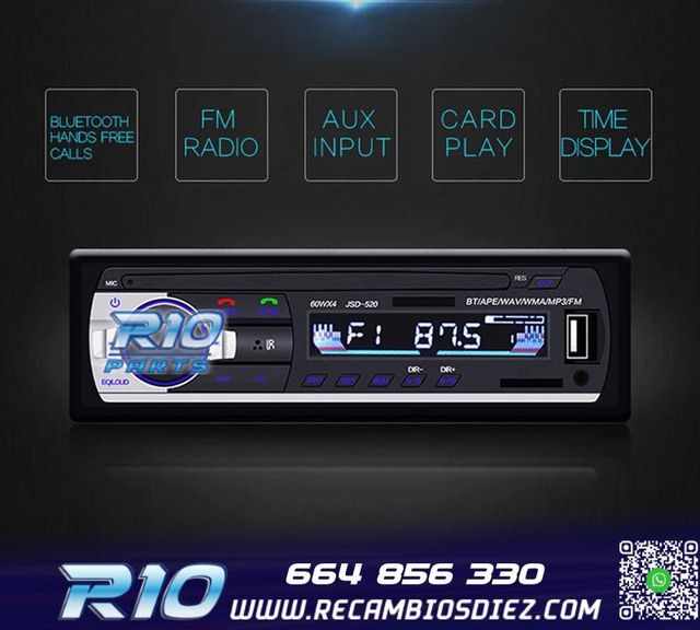 Detalles del productoMóvil: 664 856 330 - Referencia: MUL100096. RADIO 1DIN BLUETOOTH MP3 USB SD AUX Características: Radio 1DIN universal. Diseño elegante, acabo en color negro y PVC dando mayor dureza a la superficie. Bluetooth Radio AM y FM. Puerto USB y Tarjetas SD. Especificaciones: Radio: Radio AM/FM: Búsqueda y almacenamiento automático en AM / FM. Entradas / Puertos: Puerto Tarjetas SD/MMC: x1, soporta hasta 32 GB. Puerto USB 2.0 para conexión de Memorias USB, soporta hasta 32 Gb. 4 Salidas de Audio FL/FR/RL/RR (Frontal Izq y Der, Trasero Izq y Der) Entrada de antena. Otros: 3 años de Garantía