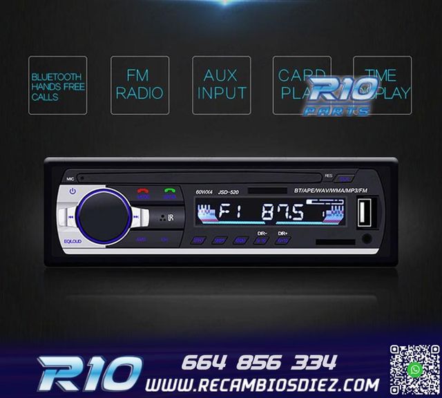 Detalles del productoMóvil: 664 856 334 - Referencia: MUL100096. RADIO 1DIN BLUETOOTH MP3 USB SD AUX Características: Radio 1DIN universal. Diseño elegante, acabo en color negro y PVC dando mayor dureza a la superficie. Bluetooth Radio AM y FM. Puerto USB y Tarjetas SD. Especificaciones: Radio: Radio AM/FM: Búsqueda y almacenamiento automático en AM / FM. Entradas / Puertos: Puerto Tarjetas SD/MMC: x1, soporta hasta 32 GB. Puerto USB 2.0 para conexión de Memorias USB, soporta hasta 32 Gb. 4 Salidas de Audio FL/FR/RL/RR (Frontal Izq y Der, Trasero Izq y Der) Entrada de antena. Otros: 3 años de Garantía