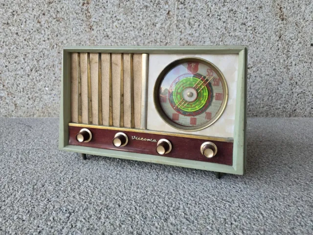 Radio antigua de la marca Victoria con un diseño clásico. - Frontal con rejilla y dial circular. - Controles frontales. - Carcasa de color verde pálido.