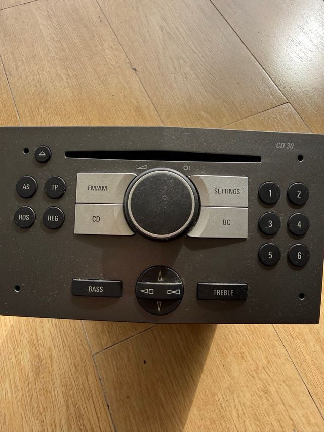 Radio original para Opel Astra H. - Modelo CD 30. - Incluye botones FM/AM, CD, SETTINGS, BC. - Botones numéricos 1-6. - Control de BASS y TREBLE.