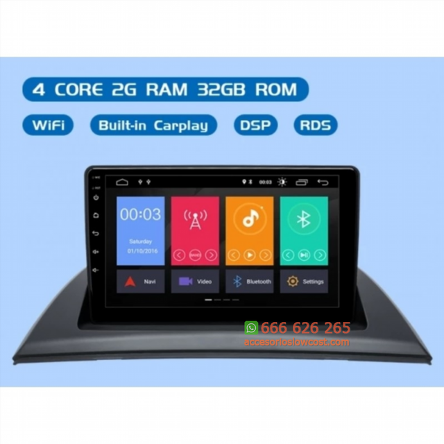 Detalles del productoREF: AL002152 Radio DVD específica Android E83 para BMW X3,(2004-2012). Características generales: Sistema operativo Android 11.0 Pantalla táctil capacitiva de 7 pulgadas. Resolución de pantalla: 1024x600, Full HD (1280P) con tecnología IPS. Procesador: CPU de cuatro núcleos de 1,2 GHz. Dimensiones del producto: 240 x 228 x 124 mm (formato 2DIN). Memoria: 2 GB de RAM DDR3 y 16 GB de ROM (memoria interna). Reproductor de DVD/CD. Reproduce múltiples formatos: MP3, MP2, WMA, WAV, ACC, MP4, AVI, FLV, 3GP, DAT, DIVX, MPEG, SVCD, VCD, XVID, JPEG. Puerto USB y SD hasta 64 GB de memoria externa. Función de espejo con tu