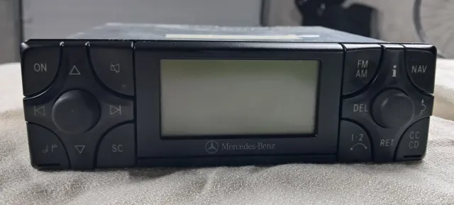 Radio original para Mercedes-Benz W210. - Modelo con pantalla LCD. - Botones de control: ON, FM/AM, NAV, DEL, RET, SC. - Incluye botones de navegación y volumen.