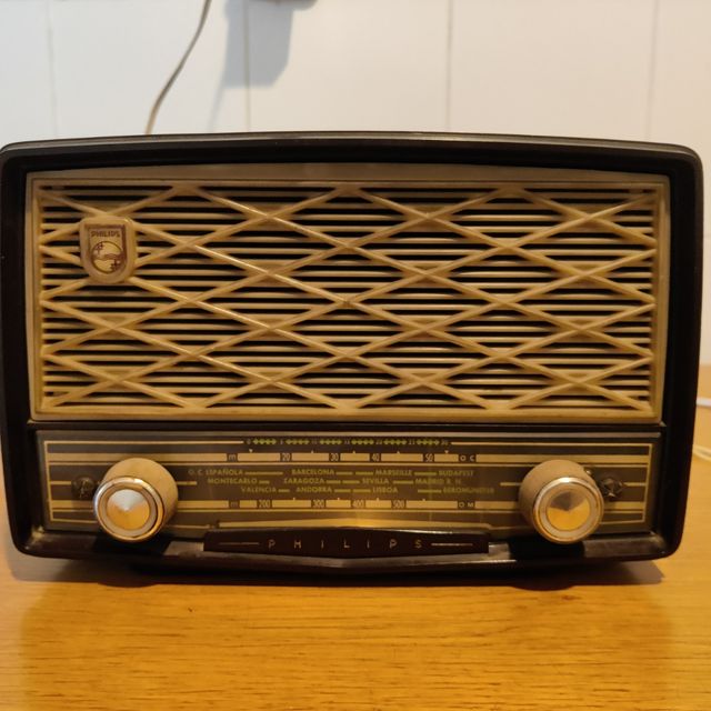Detalles del productoRadio Philips bujías años 50, modelo B2E 72-U. comprobado su funcionamiento, puedo mandar video. En muy buen estado. Medidas: 25 x 13 profundidad x 17 altura. Medidas del producto