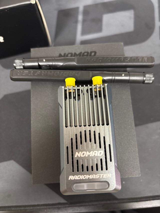 Módulo de radio Radiomaster Nomad. - Diseño compacto y moderno. - Acabado en color gris metálico. - Incluye dos antenas. - Logotipo de Radiomaster visible.
