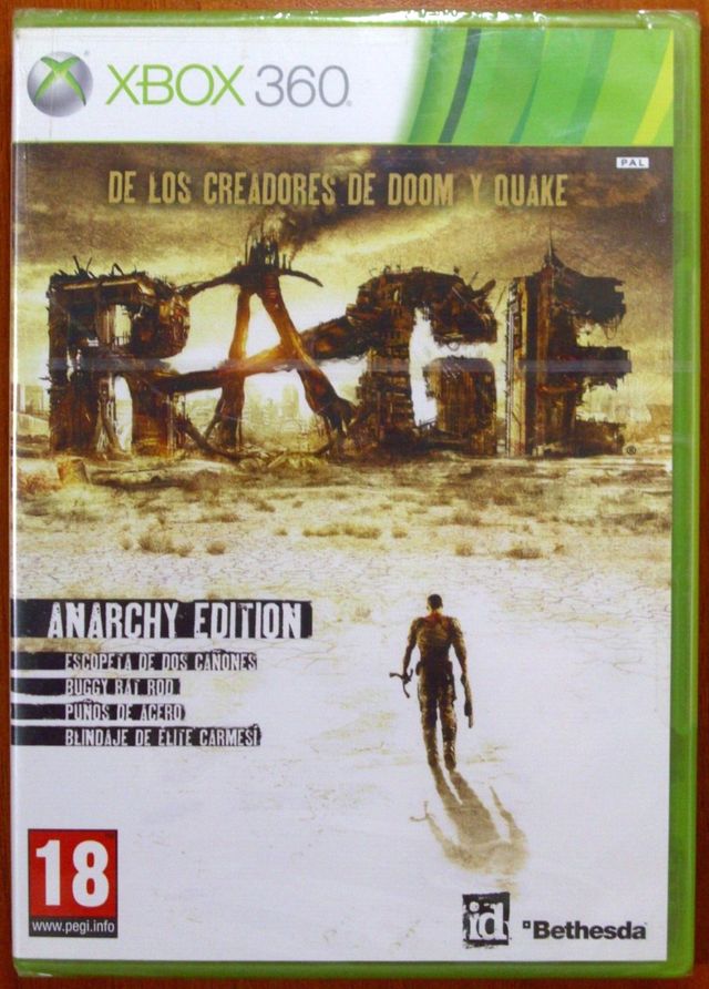 Rage - Anarchy Edition, para Xbox 360 y compatible con Xbox One S/X, Xbox Series X, Pal-España y completamente nuevo a estrenar, con carátula, manual y software del juego totalmente en Castellano. El precinto está algo deteriorado. Precio no negociable. Envíos a cualquier parte del territorio Español. Formas opcionales de pago: transferencia o ingreso bancario en BBVA, Bizum y PayPal (a través del método "enviar dinero a amigos y familiares"). Teléfonos de contacto; fijo: 951396129, móvil y whatsapp: 677648529.
