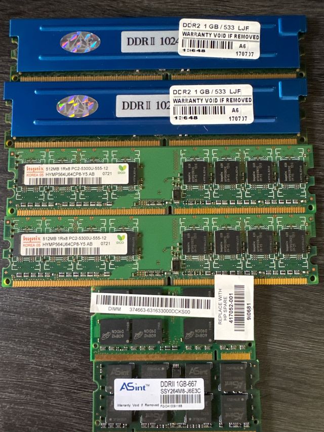 Detalles del productoVendo seis módulos de memoria RAM. Cuatro son de 512 MB y dos de 1 GB. Están en buen estado.