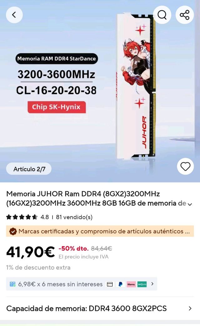 🔹Capacidad total de 16GB (2 módulos de 8GB). Se encuentra en perfecto estado, apenas se han usado 2 meses. Están nuevas! Adjunto foto del pedido hecho en marzo.