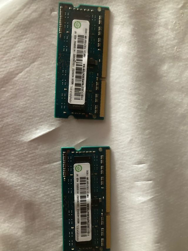 Vendo dos tarjetas de memoria RAM de la marca RAMAXEL. Están en muy buen estado. Quitadas de un macbook por 2012 - Capacidad: 4GB cada una - Tipo: DDR3 - Se venden juntas