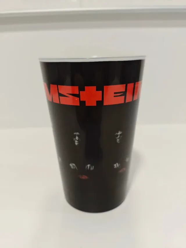 Vaso negro con el logo de Rammstein en rojo y caras de la banda. - Diseño frontal con el nombre de la banda. - Ilustraciones de los miembros de la banda en la parte inferior.