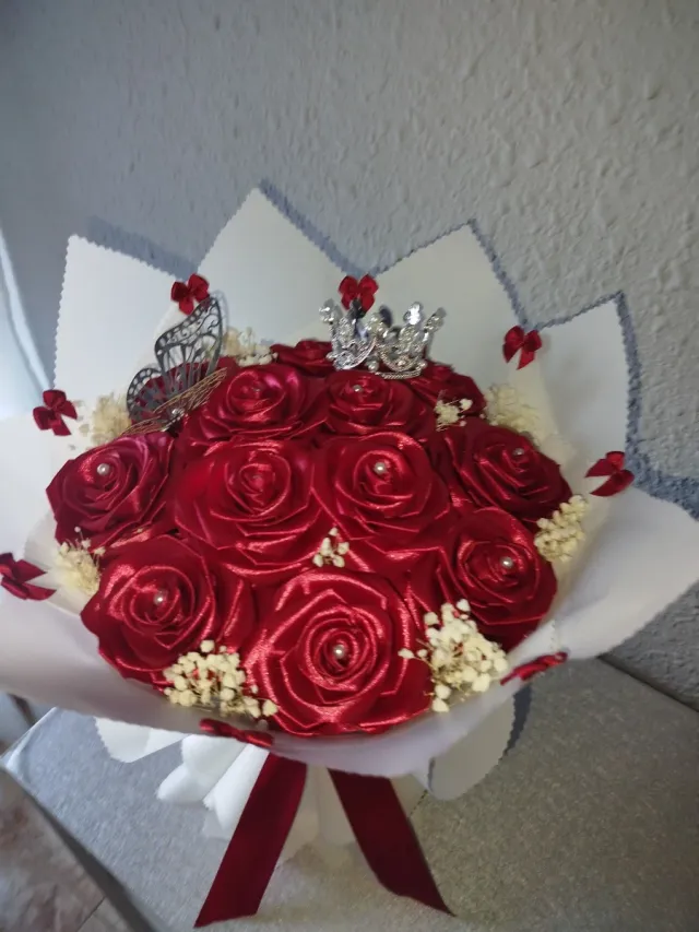 Elegante ramo de rosas rojas, perfecto para ocasiones especiales. Cada rosa está elaborada con satén y adornada con una perla en el centro.