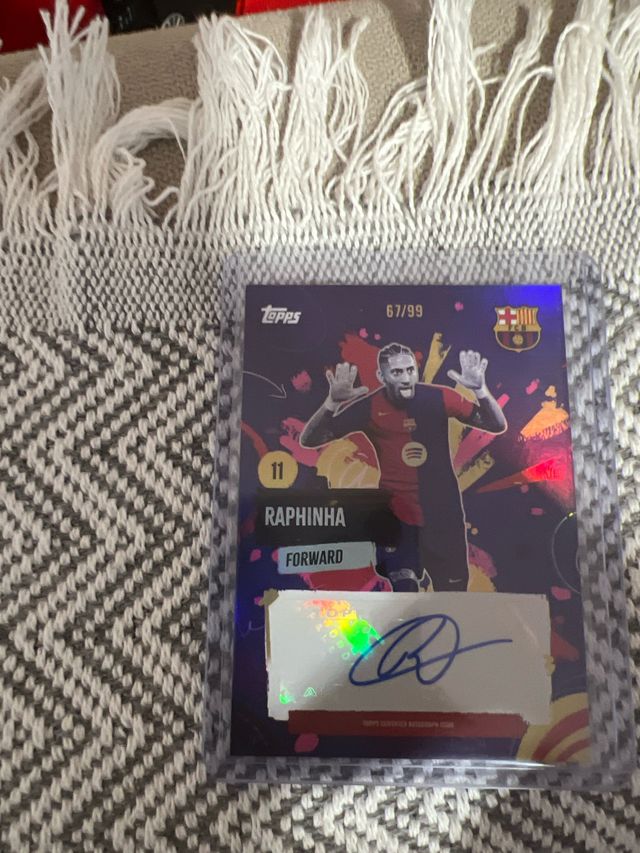 Tarjeta de Raphinha de Topps, autografiada y numerada. - Edición limitada a 99 unidades. - Incluye la firma del jugador. - Número de serie: 67/99.