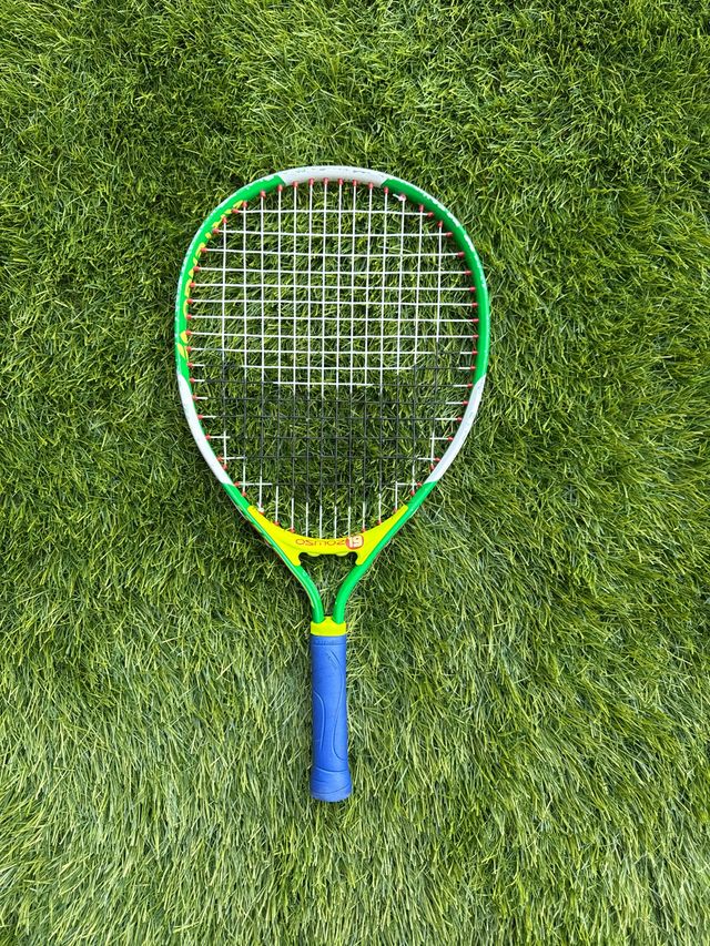 Raqueta de tenis para niño de la marca Osmoz, modelo 19. Ideal para iniciarse en el deporte. - Marco de color verde y blanco. - Empuñadura azul.