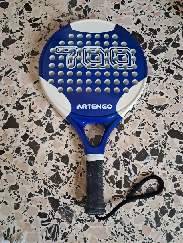 Raqueta de pádel Artengo modelo 700. - Color azul y blanco. - Diseño con agujeros. - Incluye correa de seguridad. - Presenta rasguños en la superficie.
