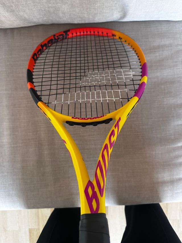 Raqueta de tenis Babolat Boost Aero Rafa, ligera y fácil de manejar. - Diseño llamativo en amarillo, naranja y morado. - Ideal para jugadores principiantes.