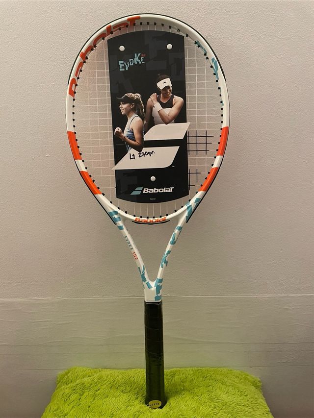 Raqueta de tenis Babolat Evoke 102. - Diseño moderno en blanco con detalles en naranja y azul. - Peso de 270 gramos. - Precio original de 54,95€. - grip1