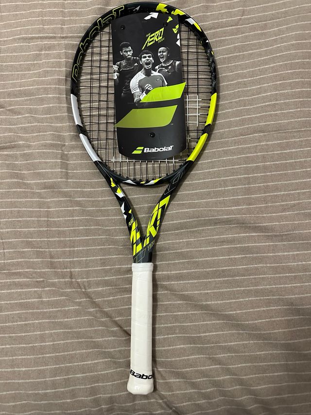 Raqueta de tenis Babolat Pure Aero. - Diseño en negro, blanco y amarillo. - Incluye etiqueta original.