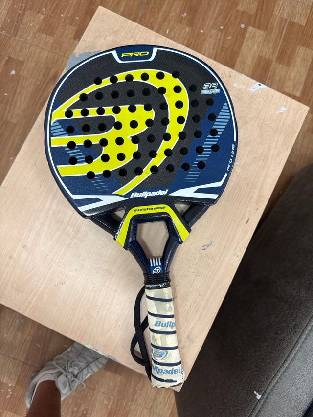 Raqueta de pádel Bullpadel con diseño llamativo. - Marco negro con detalles en azul y amarillo. - Superficie con agujeros. - Mango con grip blanco y negro.