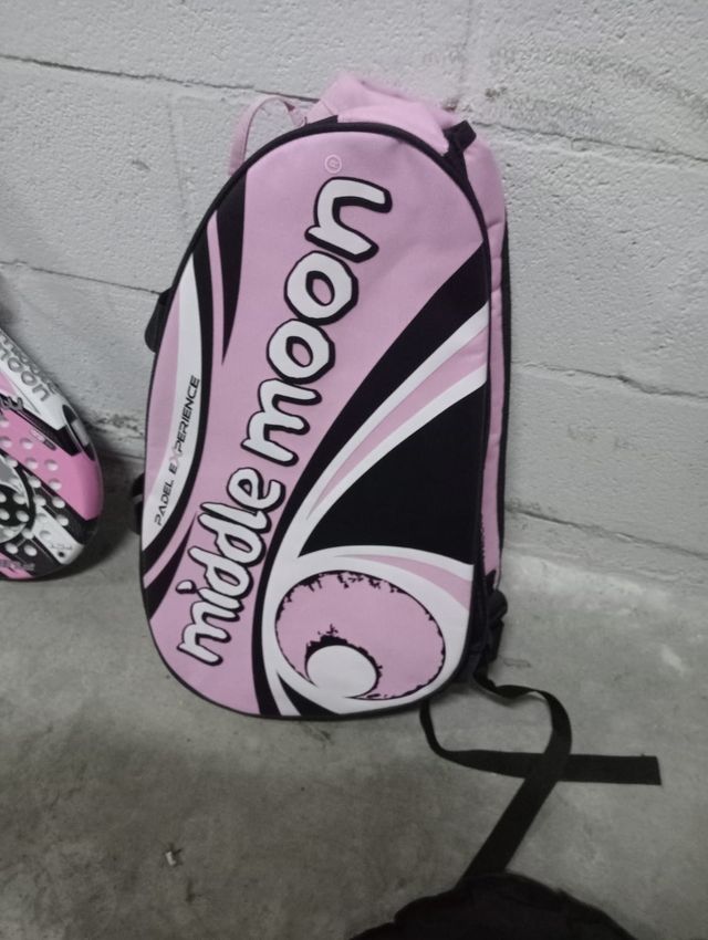 Detalles del productoRaqueta de pádel de la marca Middle Moon, con un diseño en color rosa y negro.