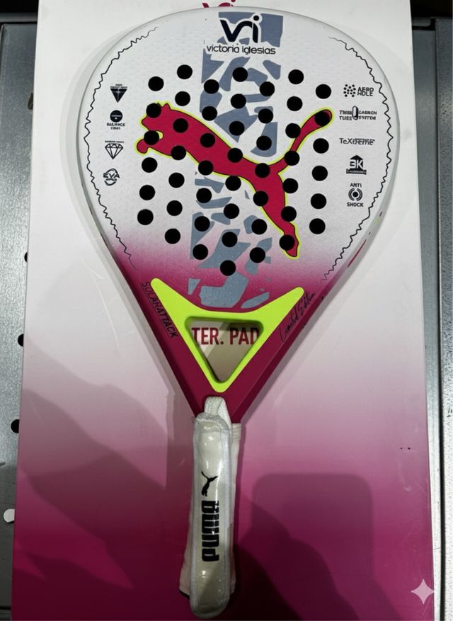Detalles del productoRaqueta de pádel Puma modelo Solarattack, diseñada en colaboración con Victoria Iglesias. Presenta un diseño llamativo con el logo del felino de Puma.