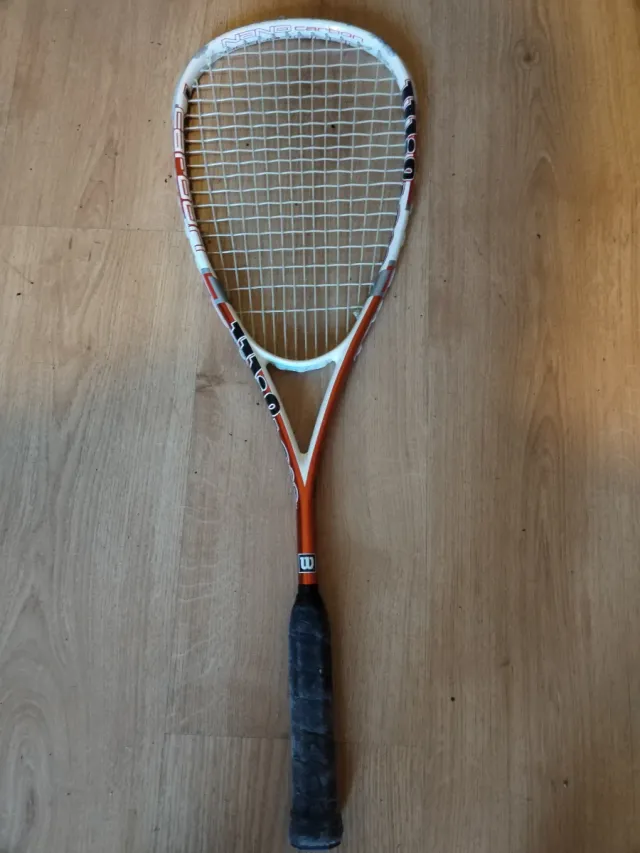 Raqueta de squash Wilson vintage, modelo Nanocarbon. - Marco blanco con detalles en naranja y negro. - Cuerdas blancas. - Grip negro.