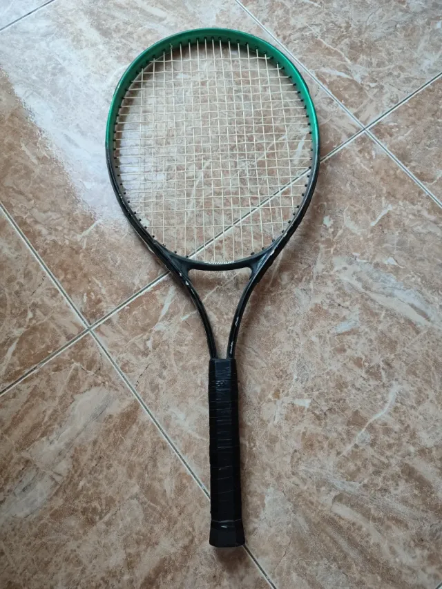 Raqueta de tenis con marco negro y detalles verdes en el aro. - Cuerdas blancas. - Empuñadura negra.