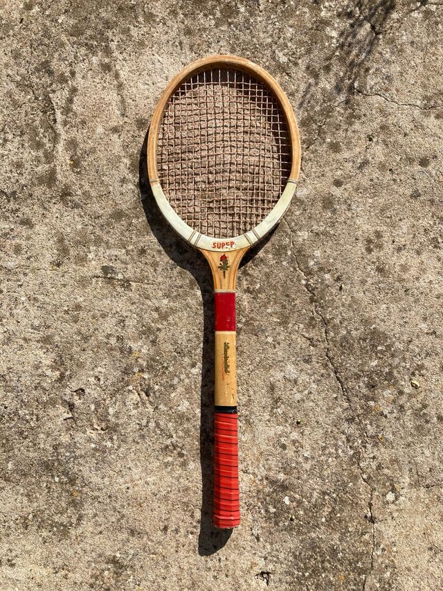 Raqueta de tenis vintage con un diseño clásico. - Marco de madera. - Cuerdas de nailon. - Empuñadura roja.