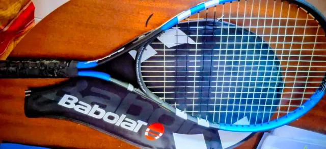 Raqueta de tenis Babolat con funda. - Diseño en color azul y negro. - Funda protectora con logo de la marca.