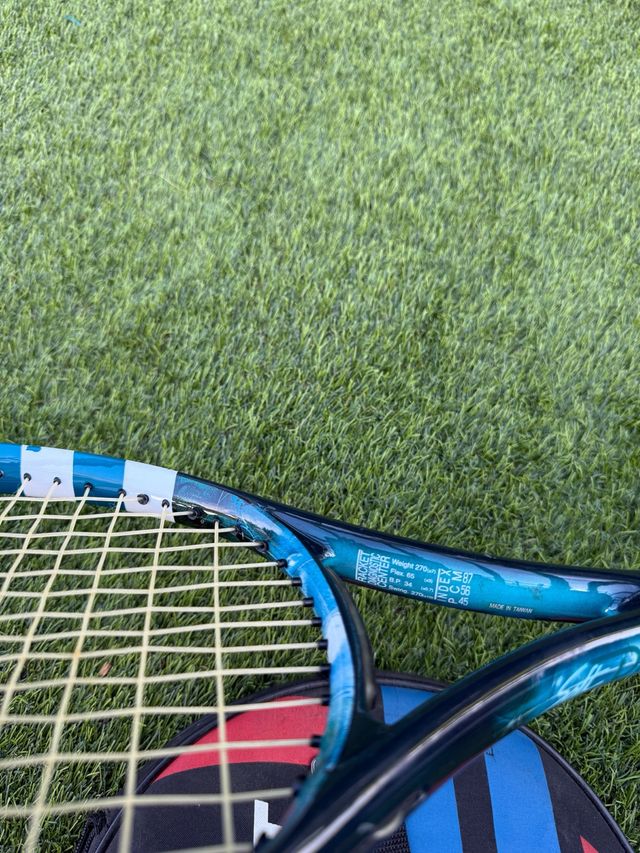 Raqueta de tenis Babolat con un diseño moderno y llamativo. - Color azul y blanco. - Peso: 270g. - Balance: 34 cm. - Patrón de encordado: 16x20. - Made in Taiwan.