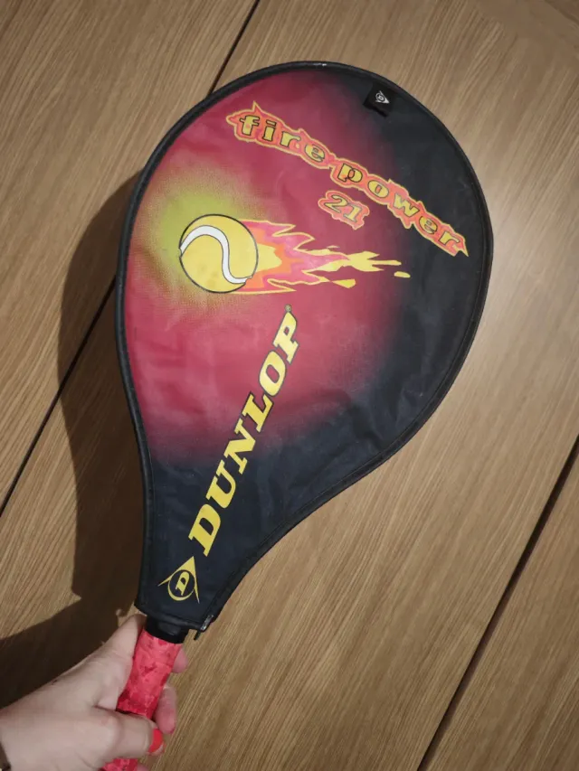 Raqueta de tenis Dunlop Fire Power 21 con funda. - Diseño con llamas y pelota de tenis. - Marca Dunlop. - Incluye funda protectora.