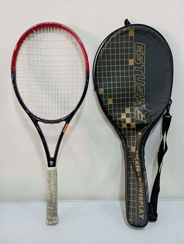 Raqueta de tenis Estusa con funda. - Boris Becker - Diseño en negro y dorado. - Incluye funda protectora. - Marca Estusa.