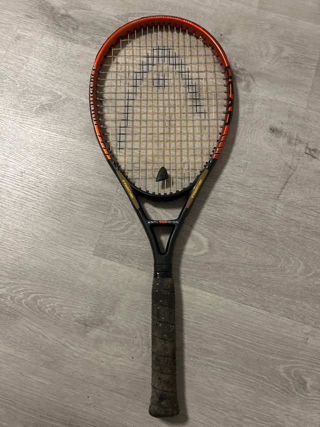 Raqueta de tenis de la marca HEAD. - Marco de color naranja y negro. - Cuerdas de color beige. - Incluye protector de cabeza.