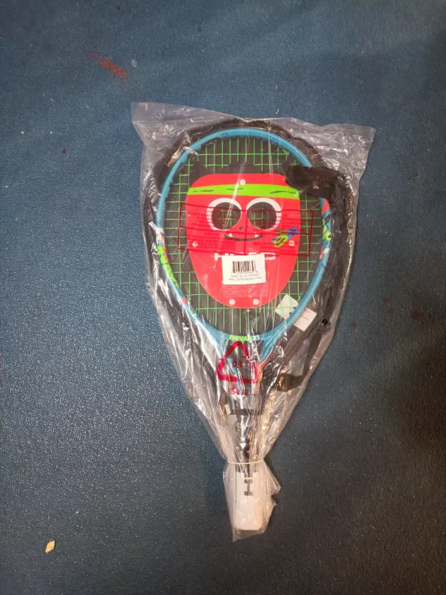 Raqueta de tenis Head de 21 pulgadas, con un diseño divertido de fresa. - Marco de color azul. - Cuerdas verdes. - Empuñadura negra.