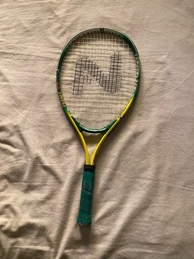 Raqueta de tenis para niños en buen estado. - Marco verde y amarillo. - Empuñadura verde. - Cuerdas blancas con diseño de 'N'.
