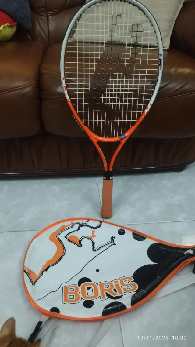 Raqueta de tenis infantil con diseño de Boris. - Marco de color naranja y blanco. - Funda con diseño gráfico.