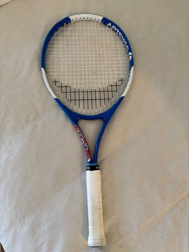 Raqueta de tenis para niños y niñas, ideal para iniciarse en el deporte. Grip nuevo. - Marco de color azul y blanco. - Empuñadura blanca. - Cuerdas tensadas.