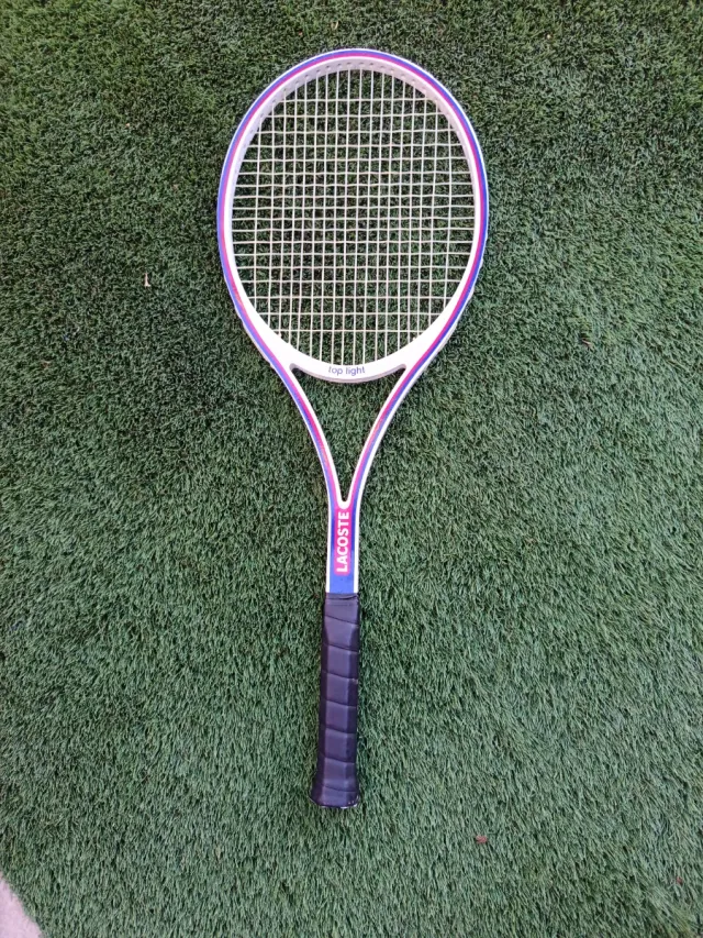 Detalles del productoRaqueta de tenis de la marca Lacoste, es de los años 80, hecha de madera y fibra, ideal para decoración o coleccionismo, muy bien conservada, solo tiene pequeñas marcas en la parte superior del marcó, fácilmente subsanables. No encontrará muchas a la venta como ésta.