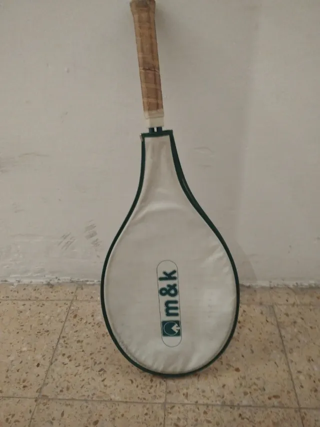 Raqueta de tenis con funda protectora. - Raqueta de tenis M&K. - Funda blanca con borde verde. - Empuñadura de color madera.
