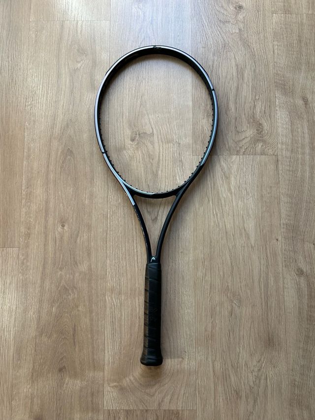 Raqueta de tenis en color negro, con un diseño moderno y elegante. - Marco de grafito. - Empuñadura negra. - Logo de la marca en el cuello.