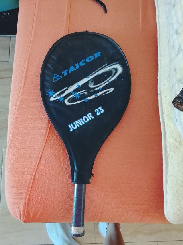 Raqueta de tenis TAICOR Junior 23. - Diseño en color negro con detalles en azul. - Incluye funda protectora.