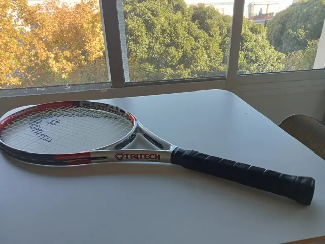 Raqueta de tenis con diseño moderno y deportivo. - Marco plateado con detalles en rojo y negro. - Grip negro para un mejor agarre. - Cuerdas blancas tensadas.