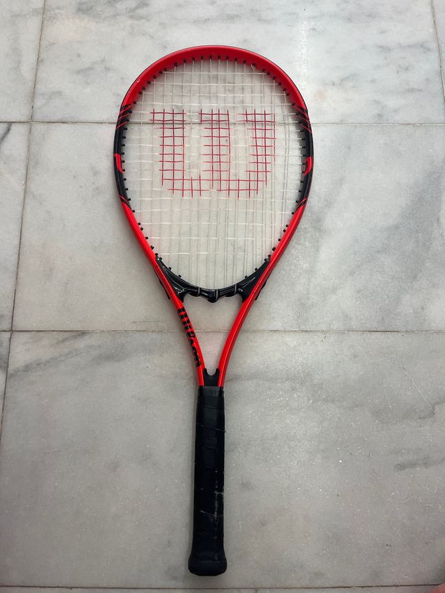 Detalles del productoRaqueta de tenis Wilson con un diseño llamativo en color rojo y negro. Perfecta para jugadores que buscan potencia y control.