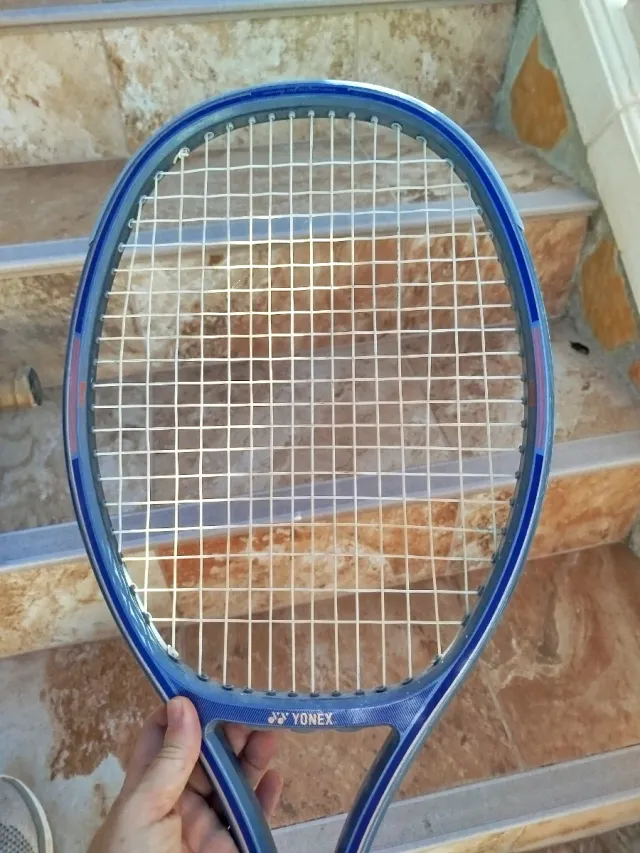 Raqueta de tenis de la marca Yonex. - Marco azul y blanco. - Cuerdas blancas. - Logo de Yonex en el mango.