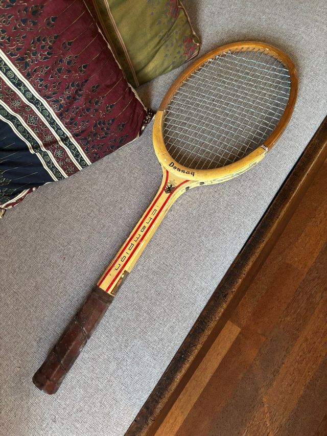 Raqueta de tenis vintage marca Donnay. - Modelo Champion. - Marco de madera. - Empuñadura de cuero.