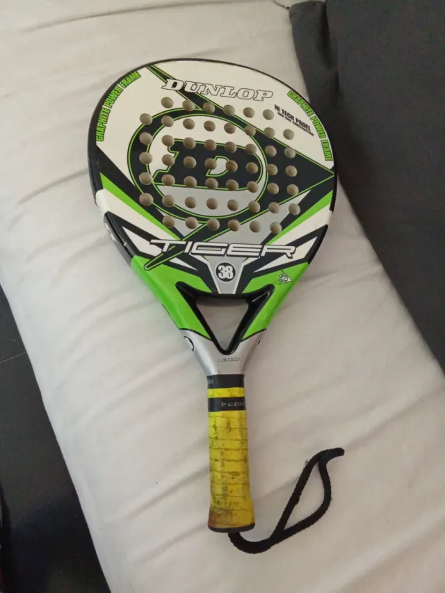 Raqueta de pádel Dunlop Tiger. - Marco de grafito. - Diseño en blanco, verde y negro. - Empuñadura amarilla. - Incluye cordón de seguridad.