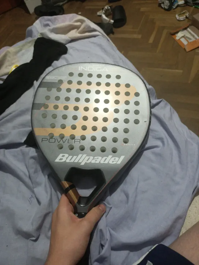 Raqueta de pádel Bullpadel modelo Power Indigo. - Diseño con agujeros. - Marca Bullpadel visible. - Modelo Power Indigo.