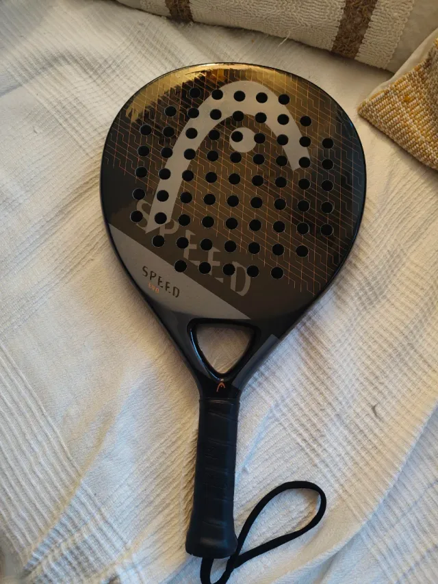 Raqueta de pádel HEAD Speed Evo. - Diseño en negro y detalles dorados. - Logo de HEAD en la cara. - Agarre negro. - Cordón de seguridad.